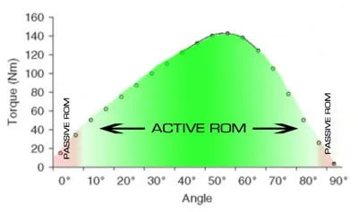The graph shows that muscles are able to create peak force at the midpoint between two joints. At the end range on either side, the muscles are able to create the LEAST amount of force, meaning that you are weakest and most susceptible to injury at the end ranges. If you are able to increase your strength at those end ranges, you not only lower injury risk and/or mitigate the severity of an injury, but you have more possibilities for movement because you are mobile throughout a larger range of motion.